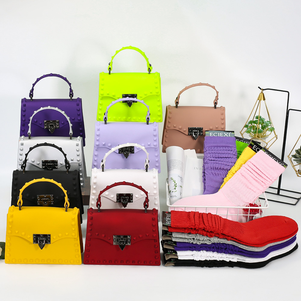 Hot Sales Pvc Leather Combination Fashion Matte Jelly Bag Rivet With Winter Souch Sock 2 Pieces Set Women Hand Bags And Purses